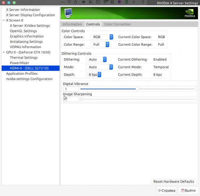 Спустя 7 лет, пришло время сменить монитор [LG 24MP76HM](https://www.lg.com/ru/monitors/lg-24MP76HM-ips-monitors) на что-то посовременней и выбор пал на [DELL S2721D](https://www.dell.com/ru/business/p/dell-s2721d-monitor/pd) с разрешением 2560x1440 75 Гц. Ниже расскажу, как я настроил окружение XFCE. Спустя 7 лет, пришло время сменить монитор LG 24MP76HM на что-то посовременней и выбор пал на DELL S2721D с разрешением 2560x1440 75 Гц. Ниже расскажу, как я настроил окружение XFCE. На удивление монитор сам определился, оставалось выставить разрешение и частоту обновления. Даже колдовать не пришлось. Но интерфейс и шрифты были слишком мелкие, необходимо было увеличить DPI Путем подбора, оказалось, что оптимальным выбором стало значение 102, большее значение урезало шрифт. После этого увеличил шрифты с размера 11 до 12. Оставался браузер Firefox в котором шрифты также увеличил На панелях и вкладках шрифты оставались мелкими и для того чтобы их увеличить необходимо ввести в адресной строке В настройках для видеокарты NVIDIA, выставил глубину цвета 8bit После всех манипуляций, всё выглядит практически также как при FHD.about:config и найти переменную layout.css.devPixelsPerPx. Путем подбора для меня оптимальным значением оказалось 1.1