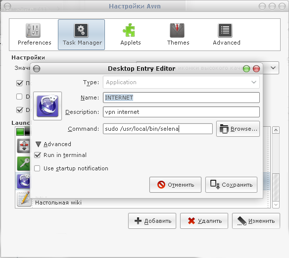 Еще несколько лет назад, я решил упростить запуск / остановку соединения с интернетом в минимум нажатий. Еще несколько лет назад, я решил упростить запуск / остановку соединения с интернетом в минимум нажатий. Получилось интересное решение в нажатие одной кнопки :) Создаем файл редактором например сохраняем. Создаём кнопку на панеле: Таким образом у нас получится кнопка последовательное нажатие на которую будет создавать и разрывать соединение 😉 Что может быть проще нажатия одной кнопки?/usr/local/bin/selena со следующим содержанием:#! /bin/bash